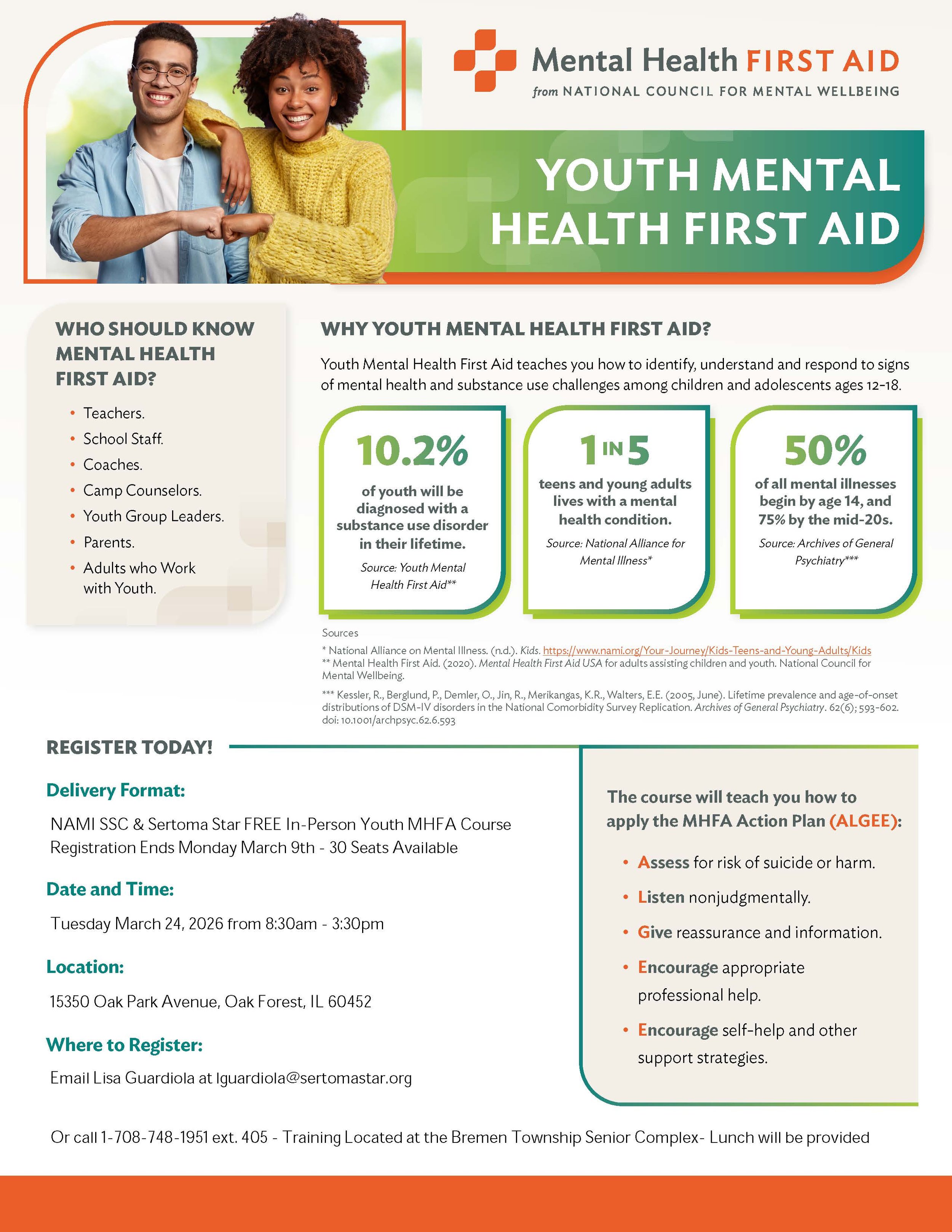 NAMI South Suburbs of Chicago and Sertoma Star Services Co-Sponsor a FREE In-Person Youth Mental Health First Aid Course on Tuesday March 24th. Join us for an informative session on how to provide initial support to young individuals experiencing mental health challenges. This training will equip you with the necessary skills to identify, understand, and respond to signs of mental illnesses and substance use disorders in youth. Don't miss out on this valuable opportunity to make a positive impact on the mental well-being of our youth! There is manditory pre-work that needs to be completed before attending the in-person instructor led training. Please contact Lisa Guardiola at 1-708-748-1951 ext. 405 or email lguardiola@sertomastar.org if you need further information.